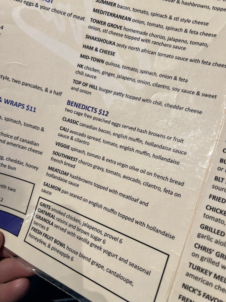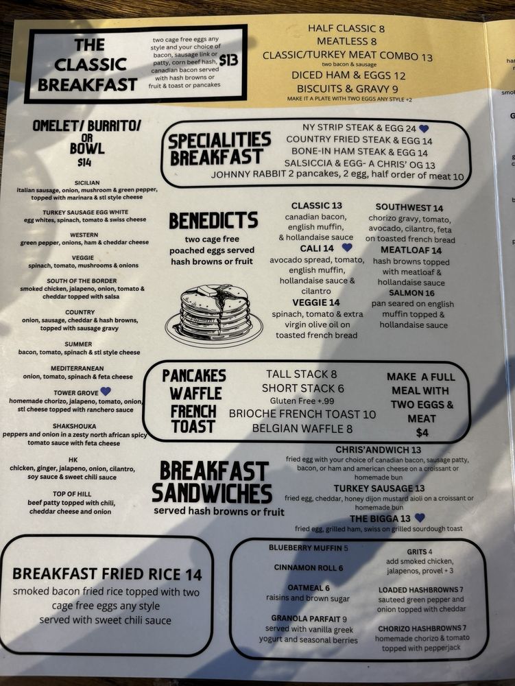 Chris' Pancake & Dining, located in St Louis, Missouri, offers a delightful American breakfast and brunch experience. With options for delivery, takeout, and reservations, this restaurant caters to various preferences, including vegan and limited vegetarian choices. With a casual atmosphere, outdoor seating, and a full bar, it is the perfect spot for a relaxed meal. The menu features breakfast specialties like Bacon and Eggs Breakfast and Biscuits and Gravy Breakfast. Indulge in their Breakfast Pancakes, Waffles, and French Toast, including the beloved Buttermilk Pancake Breakfast and French Toast Slam Breakfast. Try their unique Breakfast Skillets like the MidTown Skillet with quinoa, tomato, spinach, and feta. Chris' Pancake & Dining provides a diverse dining experience with a welcoming ambiance and delicious food options that cater to different tastes and dietary needs.